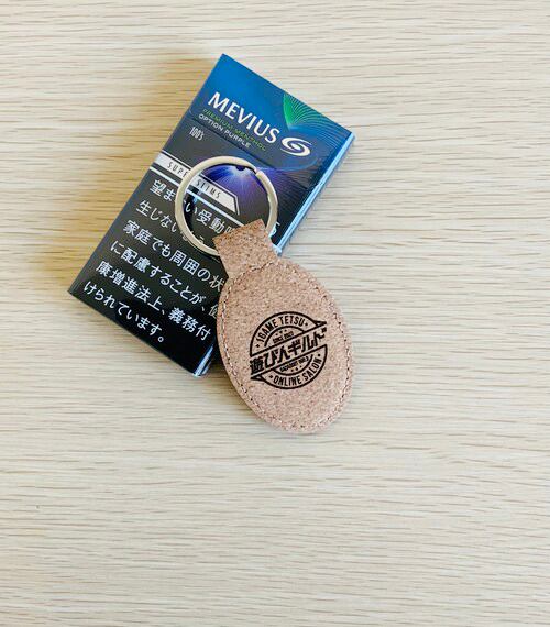 オンラインサロン「遊び人ギルド」のロゴを刻印したコルクのキーホルダー。