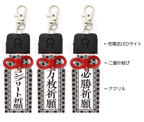 あなたのコンプリート祈願、万枚祈願、必勝祈願をサポートする充電式LEDキーホルダーお守り。心強いパートナーとして、大事なイベントを控えるあなたにぴったりのアイテムです。軽量で持ち運びも簡単、バッグや鍵に取り付けることができます。